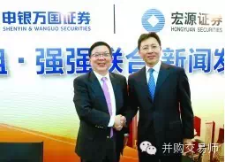 注:与以往母子公司之间吸收合并的传统模式不同,此番申万宏源重组系同一控制人旗下两家独立公司通过资本市场进行市场化平等合并的新案例。数据显示,重组完成前中央汇金公司直接持有申银万国55.38%的股份,并通过其全资子公司中国建银投资公司间接持有宏源证券60.02%的股份。强强联手后的申万宏源成为继中信证券后内地证券业界又一艘“巨舰”。